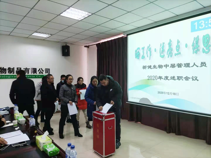 12月18日,長春祈健生物制品有限公司召開2020年度中層管理人員述職會議,公司高管、中層管理人員以及部分職工代表、技術(shù)骨干共計52人參加會議,會議由副總經(jīng)理徐俊峰主持。